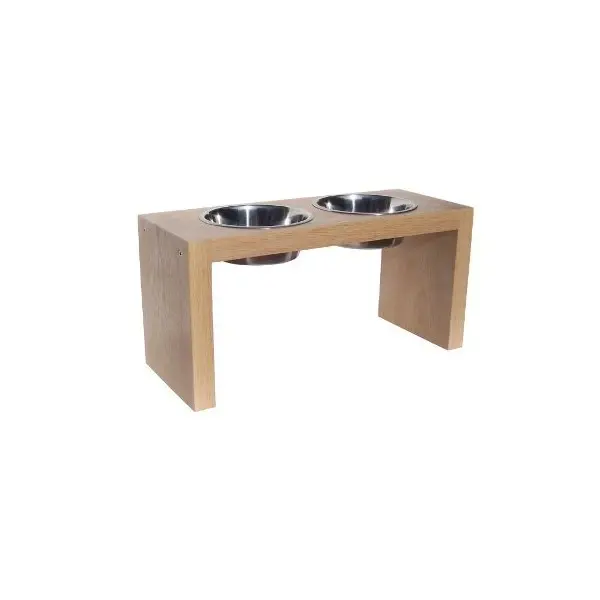 Tyto vyvýšené misky pro psy jsou určeny pro velké psy. Materiálem je dřevo dubu. Dřevo je lakováno bezbarvým, zdravotně nezávadným lakem. Tento stolek je tvarově jednoduchý a velice elegantní. Hodí se do většiny interiérů. Samozřejmostí jsou dvě nerezové, snadno čistitelné misky o objemu 1,2 litru. Díky kvalitnímu dřevu a nerezovým miskám je stolek velice hygienický a dobře čistitelný.Jídelní stolek je určen do interieru.